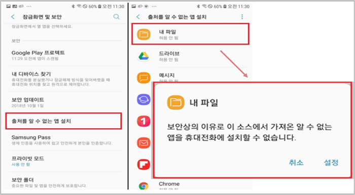 출처를 알 수 없는 앱 설치 기능ㅡ 출처를 알 수 없는 앱의 설치를 허용할 경우 모든 앱에서 적용됨