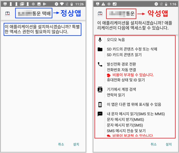 권한 비교 ( 좌 :  정상 앱 ,  우 :  악성 앱 )