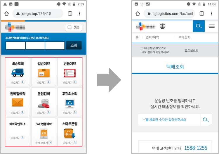 피싱사이트 접속 화면 ( 좌 :  피싱사이트 화면 ,  우 :  정상사이트 화면 )