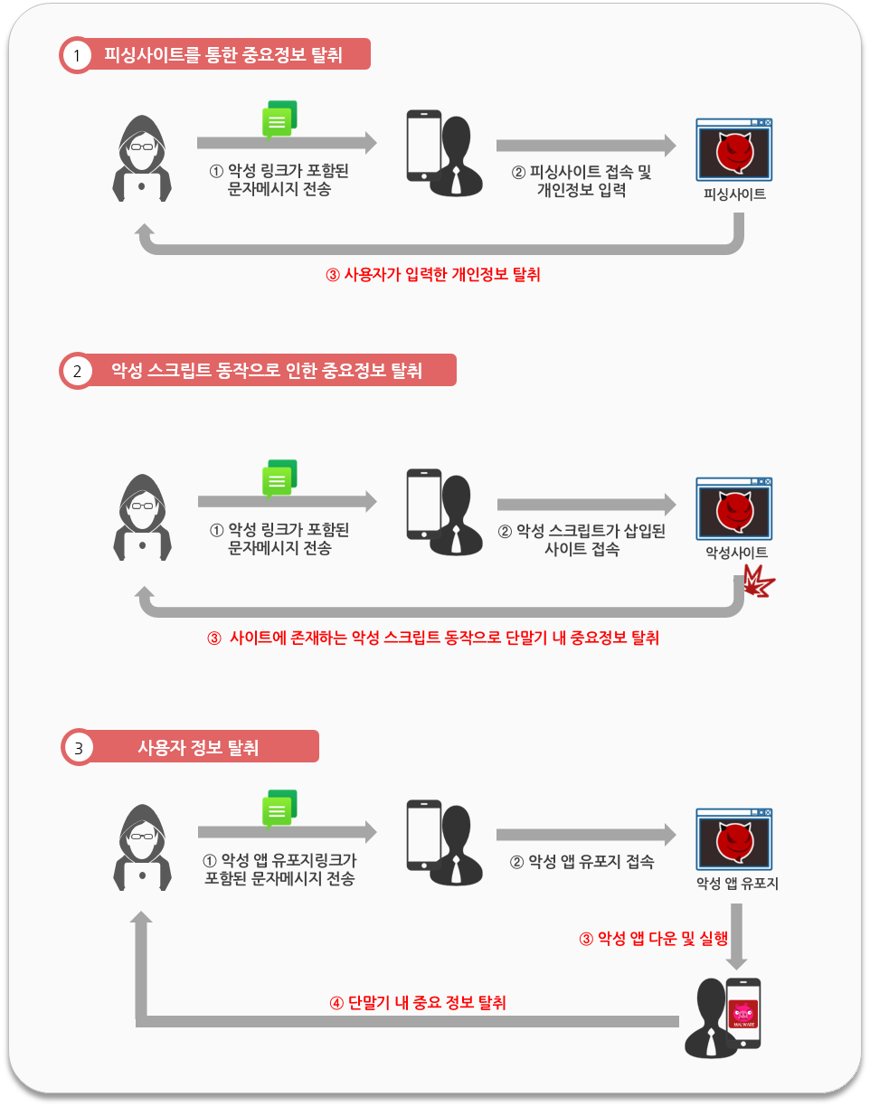 • 문자에 포함된 악성 URL·앱 설치를 통해 피해자의 스마트폰에 악성 앱을 심고,