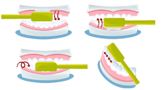- 윗니는 위→아래, 아랫니는 아래→위 방향으로 원을 그리듯 칫솔질.