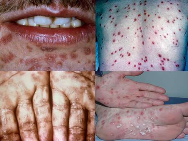 - 6주 후, 갑자기 피부에 발진이 생기고, 2~3달 후에 잠복 매독 상태가 됨