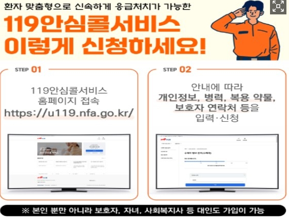 119 안심콜 서비스는 응급 상황에서 신속하고 정확한 대응을 위해 개발된 혁신적인 시스템입니다. 이 서비스는 개인 정보와 건강 기록을 미리 등록해 놓고, 응급 상황 발생 시 119에 전화만 걸면 사전에 등록된 정보가 자동으로 119 상황실에 제공되는 시스템입니다. 119 안심콜 서비스는 누구나 간단한 절차를 통해 무료로 가입할 수 있으며, 중증질환자, 임산부, 장애인, 홀로 사는 어르신, 어린이 등 누구에게나 유용한 서비스입니다. 최근에는 침수특별관리대상지역 주민들이 많이 이용하고 있습니다.