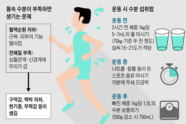 - 체내 수분이 부족하면 피로감과 근육 경직이 쉽게 찾아옵니다.